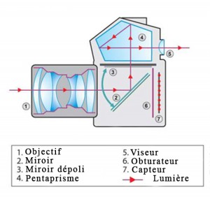 • Lors de la visée, la lumière rentre par l’objectif, arrive sur un miroir qui la renvoie vers le verre de visée dépoli. Derrière ce verre de visée se trouve un pentaprisme qui redresse l’image pour qu’elle apparaisse à l’endroit dans le viseur pour l’oeil du photographe.
