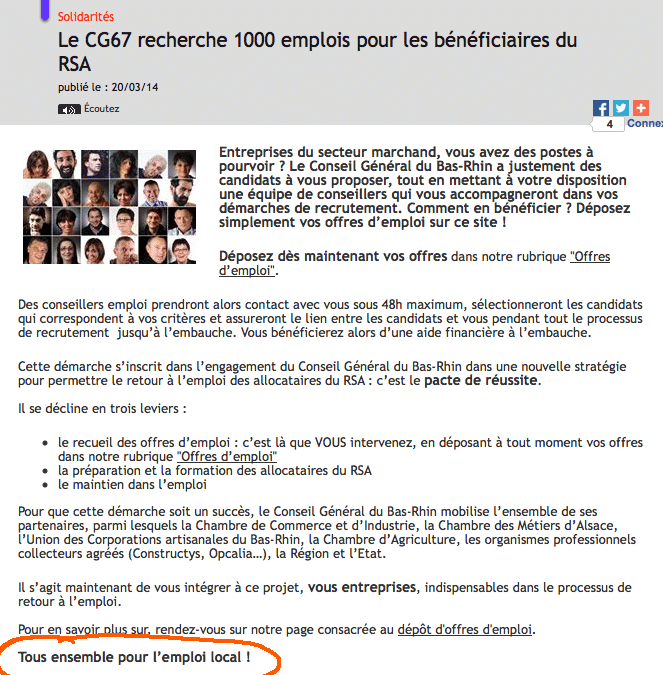 C’est là l’objet de mon courroux ! Des affiches placardées à tout va, sur les murs, dans les magasines, sur les stands…. Une campagne à grande échelle pour lutter contre le chômage. Action très noble, certes, de la part du CG67 mais entachée par un très mauvais choix d’images. Les portraits proviennent de Fotolia !!! Une banque d’images. Quand on lit le message final : « TOUS ENSEMBLE POUR L’EMPLOI LOCAL », ça laisse songeur….