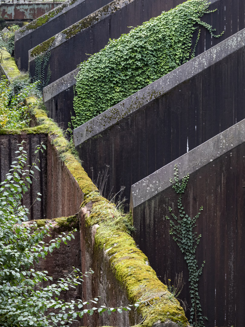 Traces, coulures et dépôts sur les parois industrielles de la Völklinger Hütte, mémoire du travail sidérurgique.